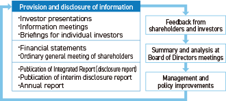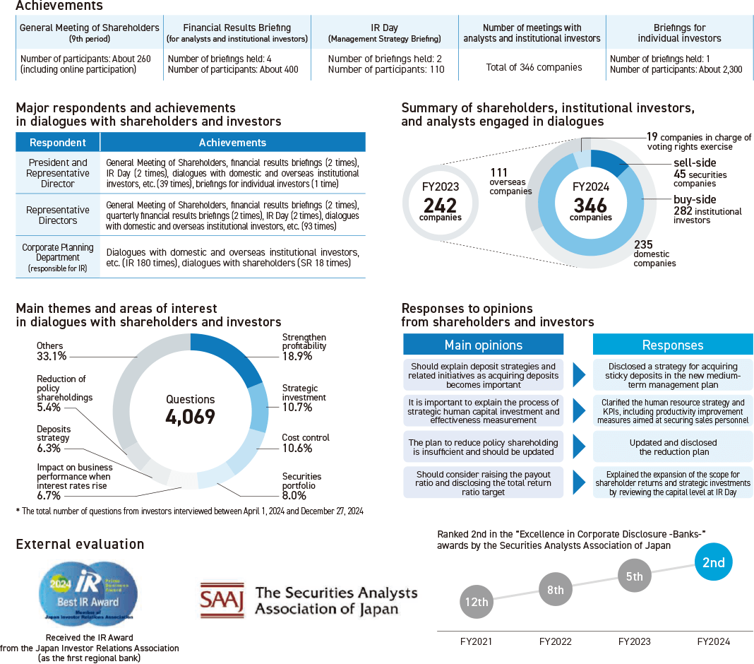We strive to disclose information in a manner that is easy to understand so that shareholders and investors can understand the Group's operations and financial conditions and make appropriate judgments about the soundness of its management. In addition, the Company places importance on opportunities for dialog with shareholders and institutional investors. We have established a policy for initiatives to promote constructive dialog and strive for proactive communication. In April 2022, we established a Corporate Communication Office in the Corporate Planning Department in order to strengthen disclosure of information, including non-financial information, and for dialog with shareholders and investors. In FY2024, we strengthened our approach to overseas investors by increasing participation in IR conferences sponsored by securities companies and steadily implemented measures for individual investors. In addition, the number of meetings with shareholders, institutional investors and analysts and the number of participants at briefing sessions significantly exceeded those of the previousfiscal year.