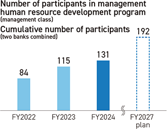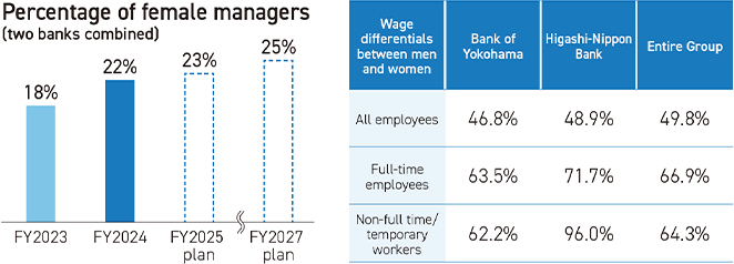 Since FY2022, the Bank of Yokohama has been implementing the Tsubaki Project to promote women in executive and management positions. Through a combination of training and roundtable discussions with outside directors, the project provides career development support with a view to promotion to management positions and fosters human resources who are candidates for management positions. Also, Higashi-Nippon Bank offers Career Support Seminars to support career development for women. With initiatives like these, the Group aims to increase the combined percentage of female managers at the Bank of Yokohama and the Higashi-Nippon Bank to 25% by FY2027 (18.1% as of the end of FY2023). Furthermore, to ensure diversity among managers over the medium to long term, the Group is aiming for the proportion of women among new graduate hires to be 30% or more.