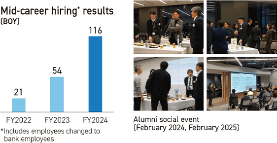 Furthermore, the “Alumni Network”*, which was launched in February 2023 as a means of diversifying recruitment routes, seeks to raise awareness and foster a sense of belonging by organizing social events and distributing stickers, and so on, leading to re-employment of alumni through the network. Along with this, the Bank is strengthening efforts in employee referrals, introductions from agents, and direct scouting activities to further diversify its recruitment routes.