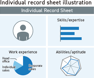 The Group has introduced a talent management system as a tool to centrally manage information on each employee’s skills, knowledge, aptitudes, and career design, and is promoting its use in strategic human resource operations to maximize the utilization of the potential of each employee. Specifically, we are establishing a system that enables strategic personnel assignment aligning with the characteristics of each sales branch and head office department, with the aim of “visualizing skills and assigning the right personnel to the right positions”, through the introduction of “individual record sheets” that consolidate information that management needs to know in order to support the careers of their subordinates (such as work experience, training history, various skills status, career design, etc.) and improvements to career design sheets and human resource development sheets.