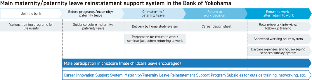 working hours and subsidies for daycare expenses and housekeeping services. The Bank of Yokohama has introduced a “support program for return from maternity leave” to ensure a smooth return to work for employees by supporting self-study during leave and holding roundtable discussions. Approximately 20% of employees who have taken maternity and childcare leave for one month or longer have used this program.