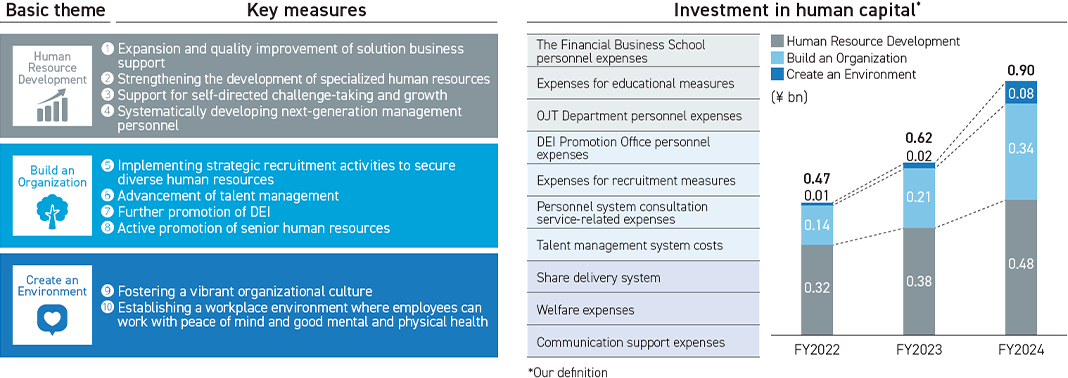 In implementing measures related to human resources based on the Group's Human Resource Strategy, we will strengthen investment in human capital, with a focus on Human Resource Development that emphasizes the development of human resources that support our solutions business, as well as Organizational Development and Environment Development.