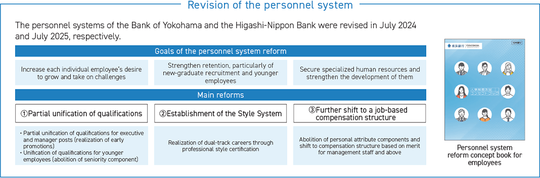 In order to transform into a solution company, in July 2024, the Bank of Yokohama revised its personnel system with three objectives: “increase each individual employee’s desire to grow and take on challenges”, “strengthen retention, particularly in new-graduate recruitment and younger employees”, and “secure specialized human resources and strengthen development of them”. By partially unifying qualifications that enable early promotion and establishing a new “Style System” to realize dualtrack careers, the Bank aims to operate personnel management based on merit rather than seniority or personal attributes, and to enable each employee to realize a career that matches their own values and aptitudes.