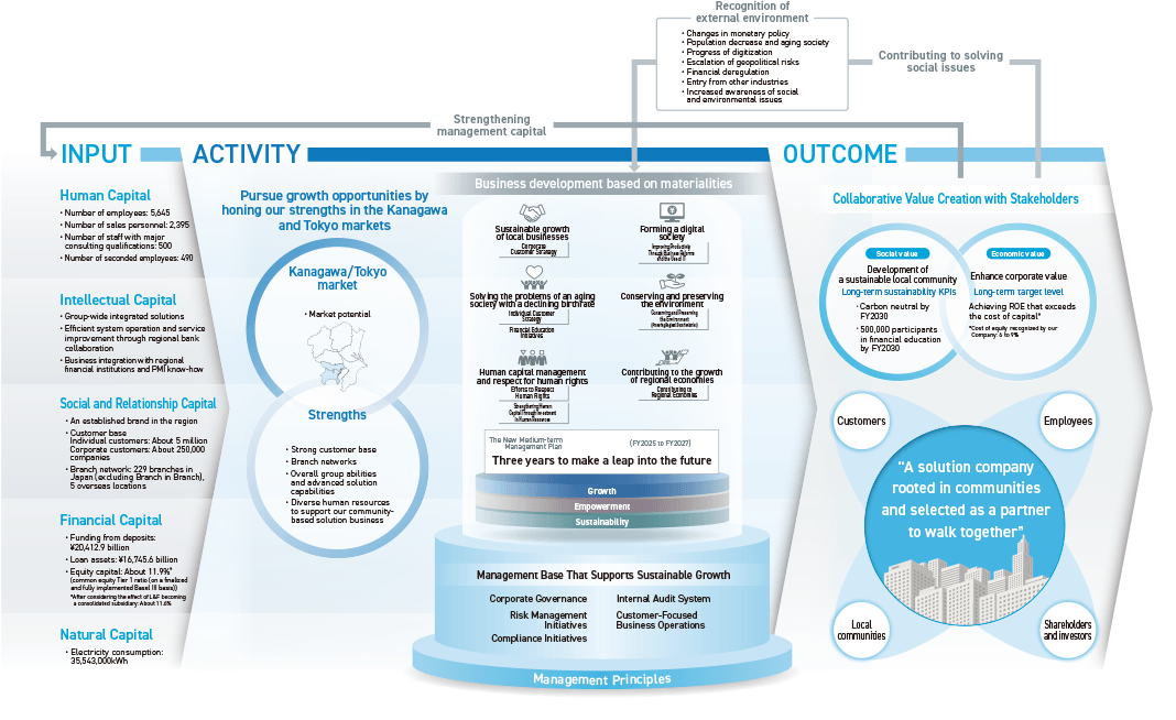 While making integrated use of the financial capital we have accumulated over our nearly 100-year history and non-financial capital such as human capital, the Group conducts materiality-based business in line with our management philosophy of “being indispens-able to our region” and through value creation with our stakeholders, we work to enhance corporate value and to develop sustainable local communities. Our aim is to be “a solution company rooted in communities and selected as a partner to walk together”.