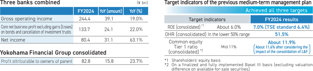 In the last the medium-term management plan from FY2022 to FY2024, we promoted “Deepening and Expansion of Solution Business” as a basic theme for growth and achieved various targets at a high level. ROE (shareholders' equity base) was 7.0%, well above the target of about 6.0%, thanks in part to the BOJ's shift in monetary policy. We were able to keep OHR in the lower 50% range despite wage increases by reducing system costs. Common equity Tier 1 ratio was about 11.9% against the target of mid 11%. However, it was about 11.6% considering the impact of the consolidation of L&F Asset Finance on April 1, 2025, so I believe we achieved the target.