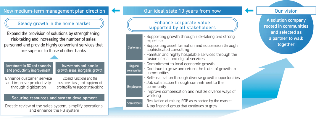 The new medium-term management plan was established by backcasting from “Our Ideal State 10 Years from Now” and from identifying issues. To achieve steady growth in the home market, we will strengthen risk-taking and the number of sales personnel to expand the number of solutions we offer. We aim to be a “community-based urban financial group” that can provide sophisticated financial services, such as investment-banking and private-banking functions, to individual customers, including small and medium sized businesses and semi-wealthy individuals, where megabanks and major securities companies have not been able to sufficiently cover the limitations of their branch networks and staffing systems. In order to realize this, we need to improve the skills of every employee. We are positioning the next three years as a period for growth. A strong relationship and excellent communication skills are required to fully understand the concerns and issues of customers. In the new medium-term management plan, we have taken the concept of “relationship banking” to heart, and we will steadily advance the plan while returning to our roots.