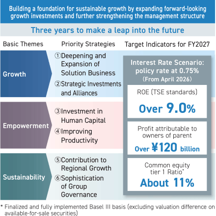 The assumption for policy rate is 0.5% in FY2025 and 0.75% from April 2026. The target indicators for FY2027, the final year of the new medium-term management plan, are ROE (TSE standard) of over 9.0%, profit attributable to owners of parent of over ¥120 billion, and common equity Tier 1 ratio of about 11%.