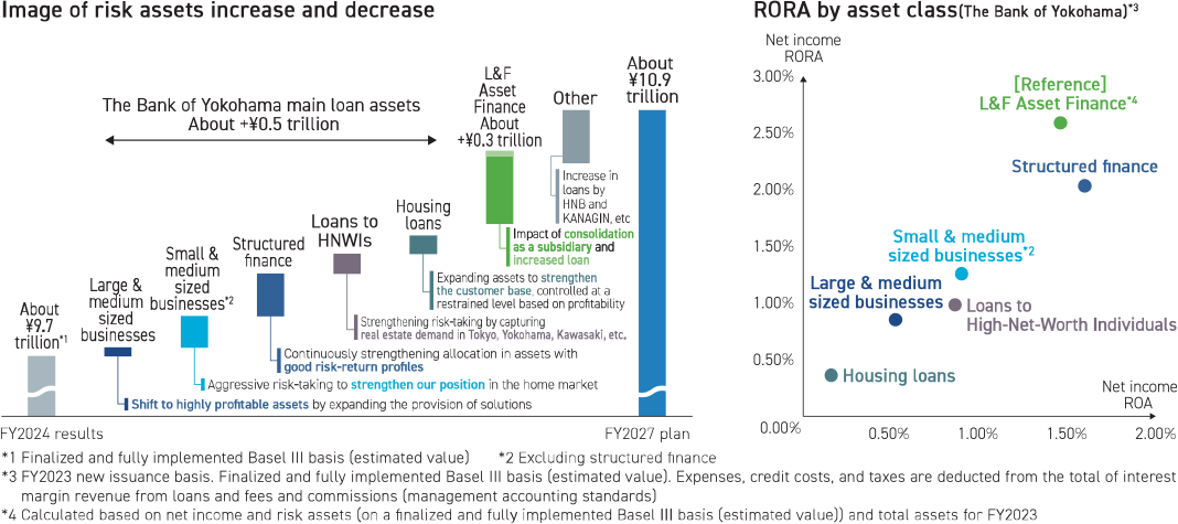 The key to enhancing ROE, which is crucial to increasing corporate value, is to expand the loan portfolio while maintaining an appropriate risk-return. To this end, we will expand our business mainly in fields with a high RORA, such as loans to small & medium-sized businesses, loans to HNWIs and structured finance. At the same time, we will selectively expand loans to large & medium-sized businesses and housing loans, where RORA is low. For loans to large & medium-sized businesses, we will strengthen the provision of solutions and promote a shift to highly profitable assets. Also, housing loans are positioned as an important product to strengthen our customer base, and we will control risk assets to a certain level with an emphasis on profitability while expanding our range.