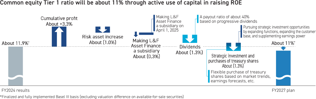 As part of our efforts to increase financial leverage, we have set a target to lower common equity Tier 1 ratio from the mid 11% level to about 11% by FY2027. In the past, we anticipated tail risks such as the Lehman shock, so we had a bigger capital buffer. However, in light of the capital resilience created by our increased earnings power, we have determined that we can withstand the risk with a smaller buffer. By increasing the number of healthy risk assets, we will increase our financial leverage and raise ROE. The common equity Tier 1 ratio will be lowered, but by expanding the use of Tier 2 capital such as subordinated bonds, we will maintain soundness while raising capital efficiency.