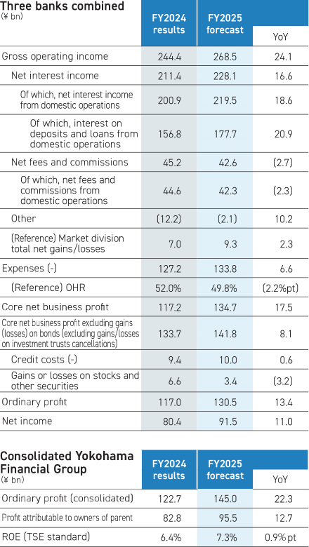 In FY2024, the top line for the three banks combined (gross operating income) increased by 19% from the previous fiscal year to ¥244.4 billion, driven by an increase in interest on deposits and loans from domestic operations due to improvements in yield spread from deposits and loans. In the bottom line (profit attributable to owners of parent), operating income rose 23% to ¥82.8 billion, marking the fourth consecutive year of growth.