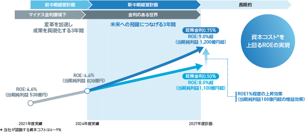 着実な利益成長と、健全性を維持した効率的な資本運営により、収益性を最大化し、新中期経営計画の最終年度に資本コストを上回るROE9.0%超の実現をめざすとともに、さらなる高い水準への挑戦を通じて、すべてのステークホルダーに支持される企業価値向上の実現をめざします。