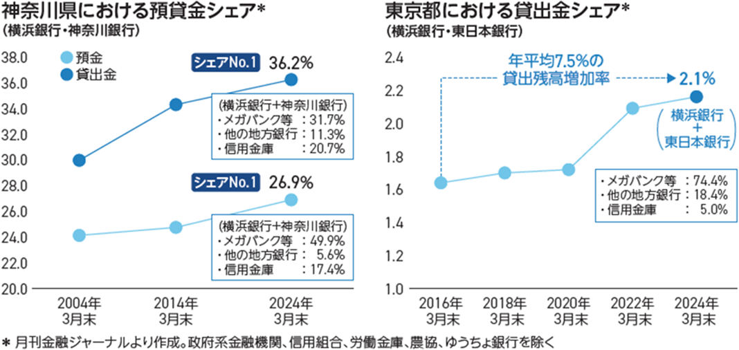 国内最大規模のマーケットにおいて、約100年の歴史で構築した強固なお客さま基盤に支えられ、預貸金はともに地銀トップクラスの水準を誇ります。また、主要マーケットである神奈川県内でのシェアは年々拡大しています。