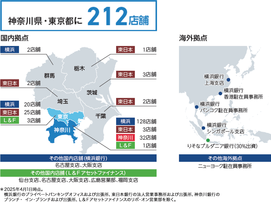 国内は神奈川・東京を中心とした稠密な店舗ネットワークを通じて、地域の課題解決に取り組んでいます。