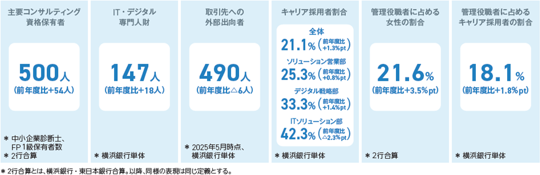 地域金融機関である横浜銀行・東日本銀行・神奈川銀行は、プロパー行員の最初の配属先を原則営業店(専門人財等を除く)とし、地域・お客さまと向き合う経験を重ねた人財がお客さまの課題解決に向けたソリューションの提供に努めており、ソリューションビジネスの根幹を支えています。